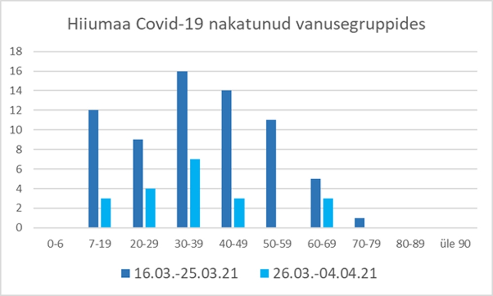 Hiiumaal oli eilse, 5. aprilli seisuga Terviseameti kinnitusel jälgimisel 12 COVIDpositiivset ja 9 lähikontaktset. Nakatunud on vanuses 9 kuni 67 aastat. Jätkuvalt on kolmandikul juhtudest nakkusallikas teadmata. 55% haigestunuid on nakkuse saanud pere- ja 10% tutvusringkonna kontaktist. 1/3 nakkuse saanuist on naised, 2/3 mehed. Hiiumaa haiglas COVIDpatsiente ravil ei ole.