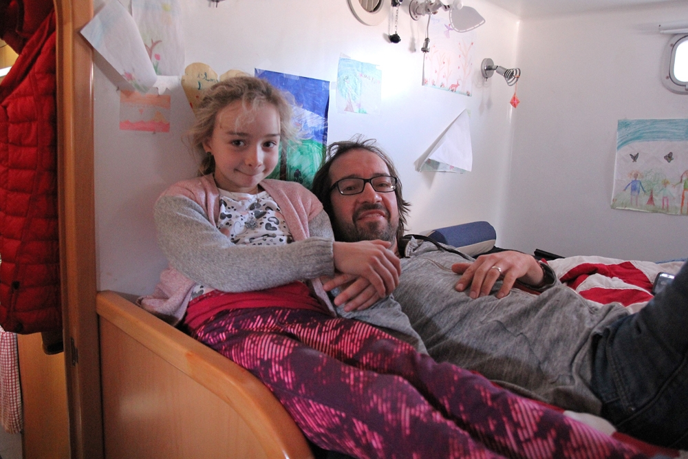 Valerie kutsus meid lahkesti laeva vaatama ja lubas pilte teha, kus ainult soovime. Tänu sellele, et katamaraani põhjaks on justkui kaks paati ja peal tekiehitus, jagub seal ruumi nii laste kui vanemate “tubade”, köögi kui duširuumide, isegi pesumasina jaoks.