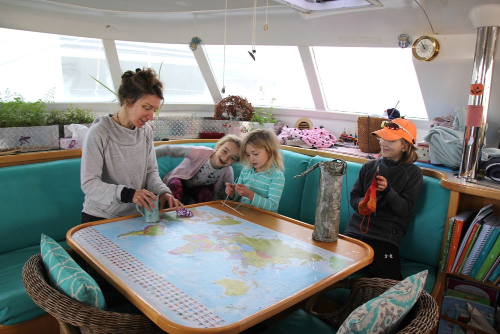Kui me kohale jõudsime, möllas katamaraani avaras salongis maailmakaardiga varustatud laua ümber kolm lustakat last, Gabriel (10), Lauren (8) ja Amelia (5). Saabumise hetkel oli käimas kudumistund, mis samal hetkel ka lõppes.