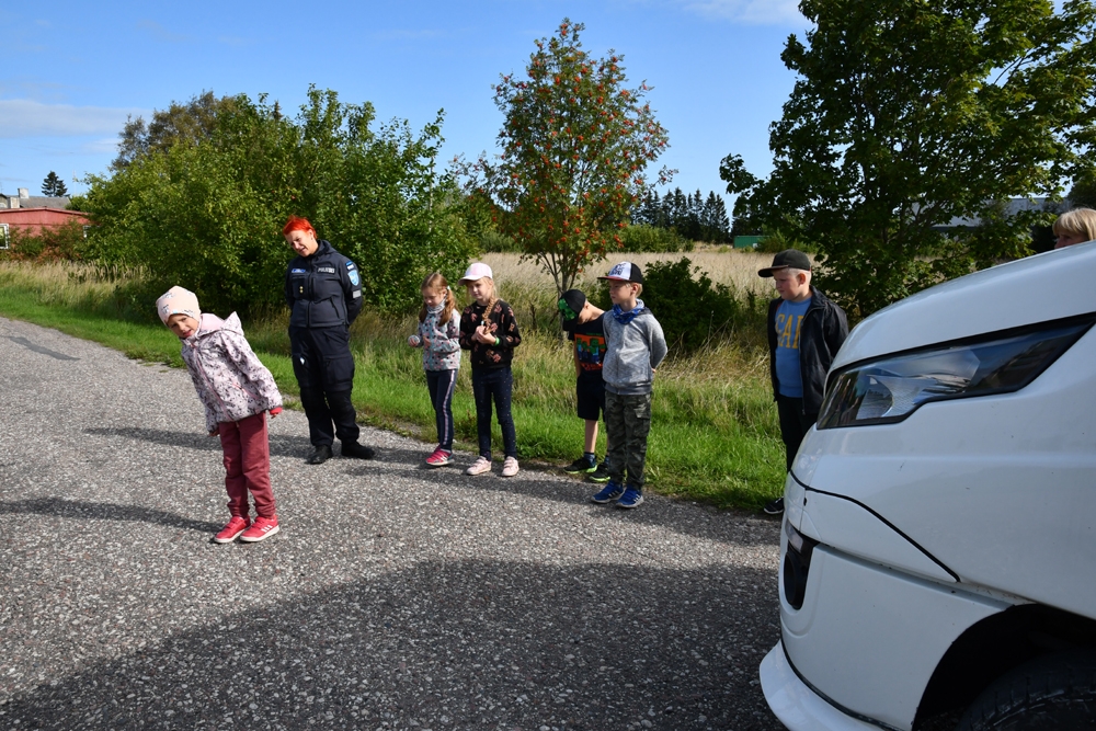 Ülemisel pildil uurivad esimesse klassi minejad koos politseinik Kädu Aasmaga, kas seisva bussi tagant on näha maanteel liginev auto.