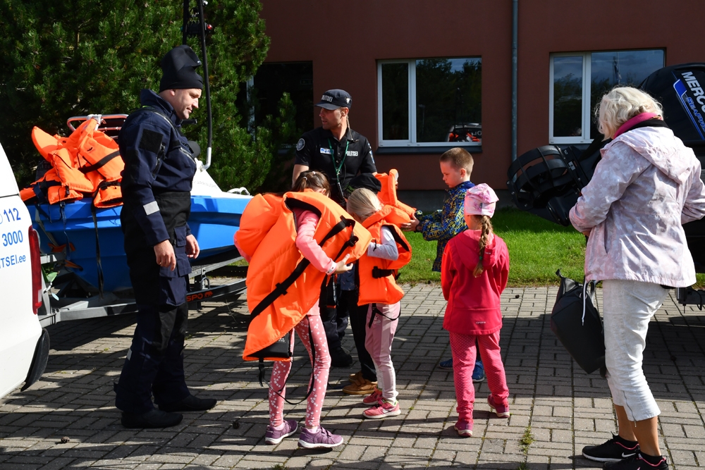 Alumisel pildil õpetavad politseinikud Tõnis Saarnak ja Vahur Pihlamägi, kuidas päästevesti selga panna.