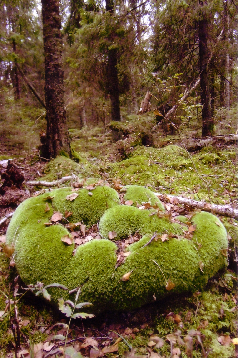 Tiheda kuusemüüri taga on üksikute väludega kuusik, milles sekka kaski ja isegi üks saarepuu. Siin-seal jälle näsiniini, palju alles pisikesi. Ka harvu lodjapuu ja türnpuu kribalaid. Üldises samblakattes harvalt maikellukest, lillakat, sinilille, seaohakat, jänesesalatit, üks törts saluheina, tiba ussilakka, paiguti pilliroogu, veidi sõnajalgu jne. Üldmulje siiski väga samblane. Kõrval on hõredam lehtpuisem ja rohusem metsariba. Käisin laiemaltki ringi, ent ei mingeid kingi (näh, riim tuli!). Kohtasin vaid igasugu tundmatuid seeni ja teada-tuntud vastikuid põdrakärbseid. Nii et jah, ei saa siia Leluseljalt versta jagu lõunas asuvasse, lankide vahele veel püsima jäänud metsatükile kuldkinga leiukohta kirja. Aga ehk kuskil neis metsades siiski veel on…?