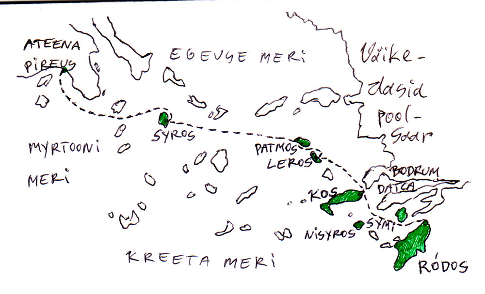 Istume laevalael, vahime valevat Pireuse majade-džungli panoraami. Sadama akvatoorium meenutab Helsingit – asend, kuju. Aga tegelt, oh, ei jõua pärale, kus ikka oleme. Ees ootab me elu pikim merereis, mingi 14 tundi ja 340(?) km. Mu seni pikimad on olnud neljatunnised otsad Roomassaare–Ruhnu ja Mõntu–Ventalinna (Kuramaa) vahel. Kui poleks nii hirmus magamata (kolm ööd liinibussides läbi Mandri-Euroopa), oleks palju vägevam tunne. Praegu on vaid vaikne ajuti tekkiv rõõm. Tulin Hiiumaalt praamiga mandrile, siis läbi terve Euroopa bussidega, nüüd palju suurema praamiga kaugele Aasia ranniku lähedale.