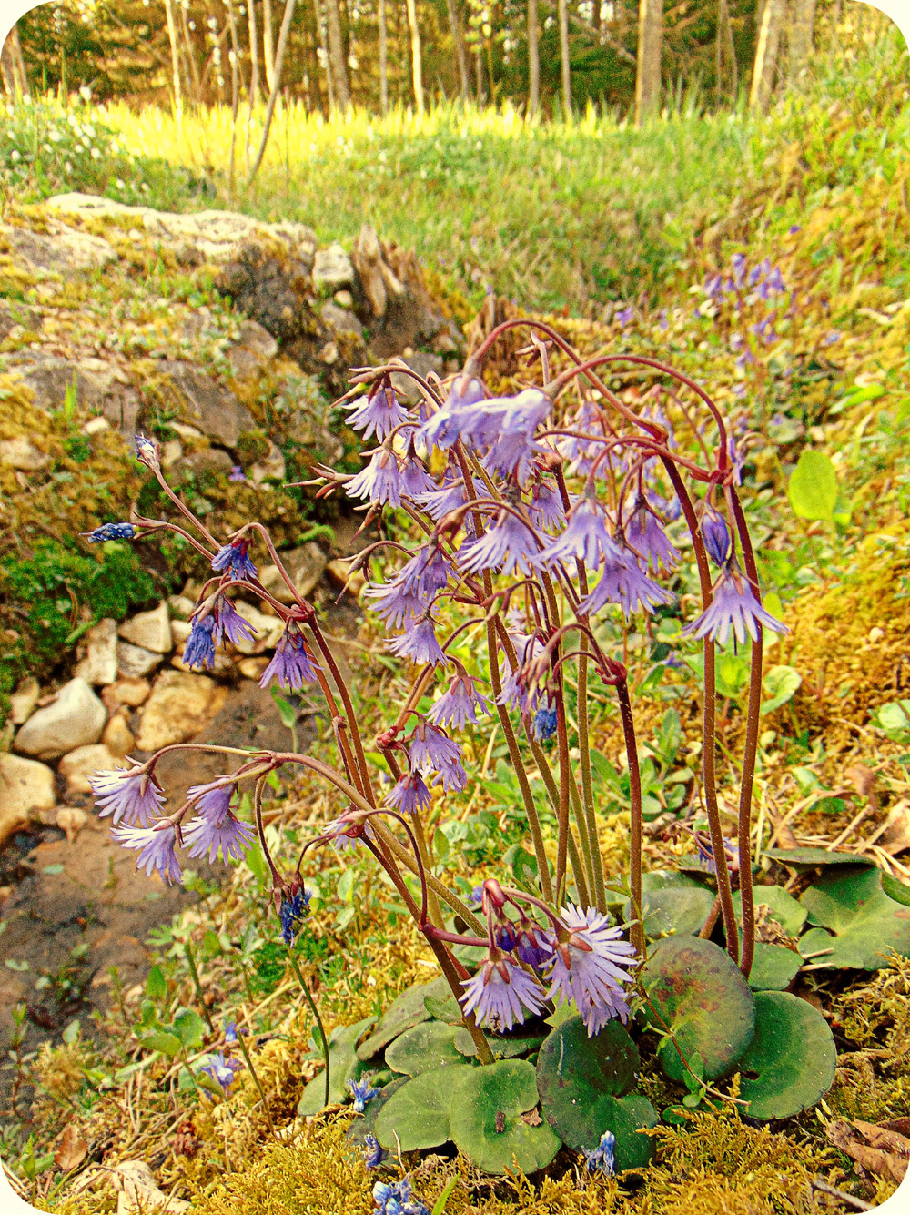 Soldanelliõied vaikselt soliseva veekardina taustal…