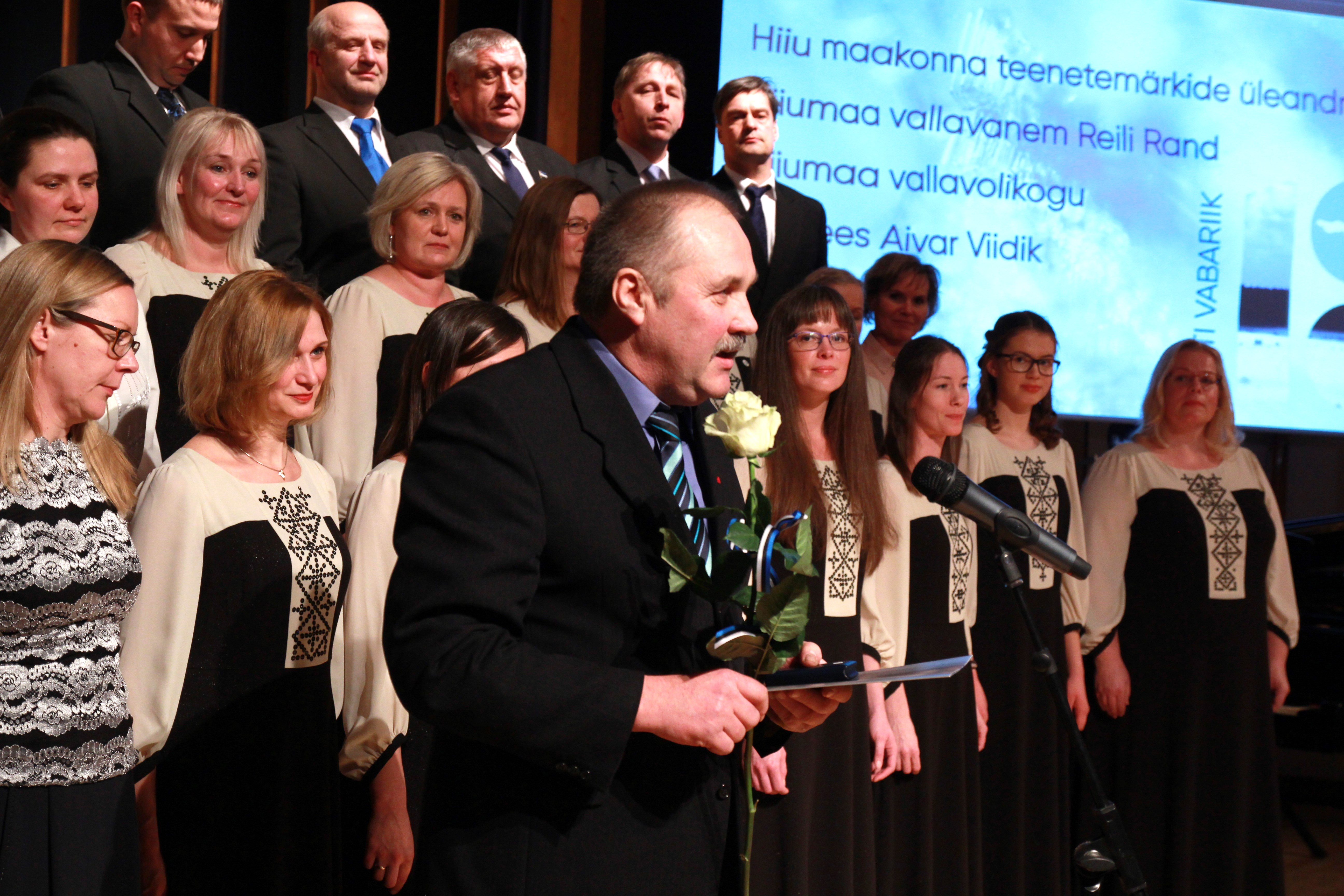 Kui Hiiumaa vallavolikogu esimees Aivar Viidik reedel Käina huvi- ja kultuurikeskuses toimunud Eesti vabariigi sünnipäeva pidulikul kontsertaktusel kuulutas välja maakonna teenetemärkide saajad, puhkesid saalis ovatsioonid ja Kärdla Kammerkoor laulis “Ta elagu!”.