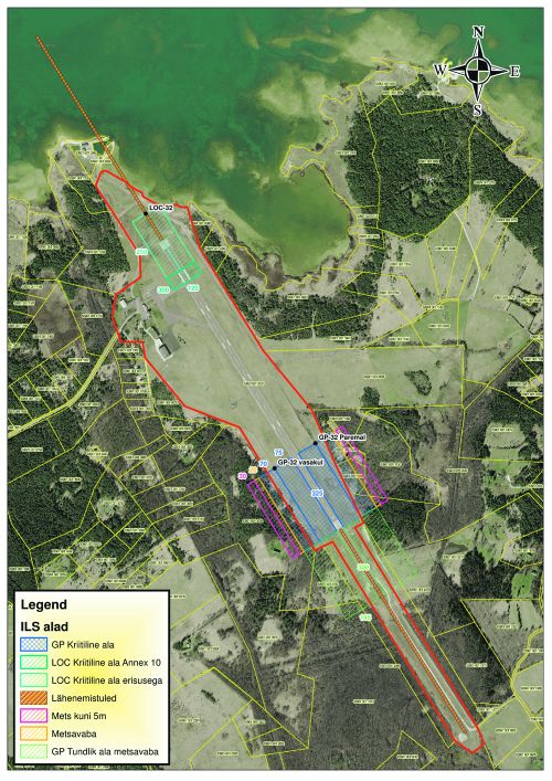 Lisatud skeem visandab kehtivaid nõudeid ja tootjate käsiraamatuid arvestades teoreetilise valmisoleku ILSi paigaldamiseks. Numbritega on märgistatud alade servade mõõdud meetrites. Maapoolses otsas on alade laiuse mõõdud arvestatuna lennuraja servast. Punane joon on lennuvälja kinnistu piir, must punkt ILSi masti asukoht. Üldjuhul peaks see asuma heleroheliseks viirutatud takistustevaba LOC-ala keskel. Kuna ühelt poolt piirab seda ala meri (sh piirdeaia nurk, avalikus kasutuses tee, kuhjuv jäämass), teiselt poolt nõue, et ala ei tohi ületada ruleerimisteed ja kolmandaks nõue, et ala peab olema 300 meetrit pikk. Järelikult masti, mis tegelikult on antennikomponentide laialipaigutatud komplekt, mere poole nihutada ei saa. Sel juhul peaksime sõidutee sulgema või siis hakkama merd pinnasega täitma, et sõidutee säiliks – kuniks jää seda ikkagi kahjustab.