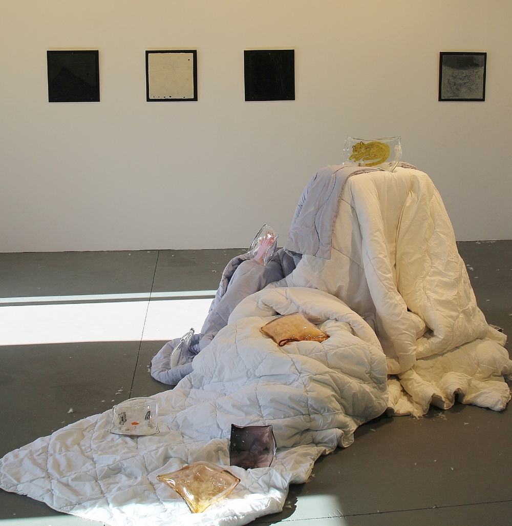 Näituse pealkiri – padjast-tekist võtab esemed teemana kenasti kokku. Andra, kes töötab Kunstiakadeemias, on teinud tööd sulatustehnikas – võtnud kipsvormid voodilinadelt, suutes detailideni edasi anda tekstiili faktuuri ja siis oskuslikult kasutades erinevaid värvilisi lehtklaase, suutnud luua graafiliselt tundlikud “klaaspildid”.