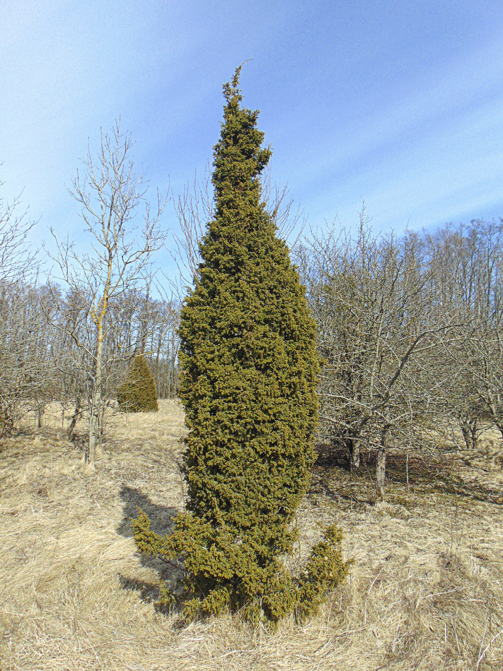 Sedakorda paelus siin tähelepanu veel üks kadakas. Ligi nelja meetri kõrgune kui pügatult tihe-tihe sammas, kel põhjakülg siiski üpris hõre. Fassaad on aga igatahes uhke. Taolisi küpreslikke sammasjaid kadakaid ei leia me maal teps mitte sageli. Pigem võiks öelda, et sellised on suisa haruldased.
