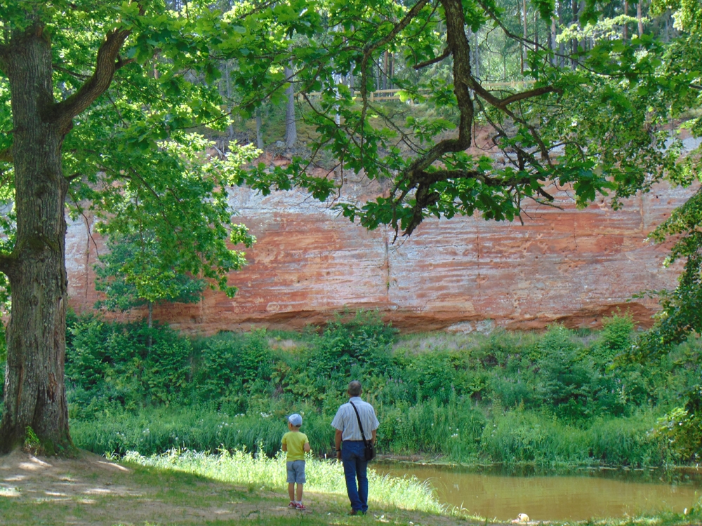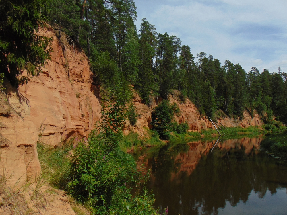 Põrutasime mööda künklikku metsateed päris selle lõpuni välja Skainaskalnsile ehk Kajamäele. Ilus oli siin. Tammepuudega küngas jõekäärus, vesikanepid ja pikalehised mailased vohamas kaldapiiridel. Vastas kerkimas punav sile paarikümne meetri kõrgune kaljusein, ülemises pehmemas osas mustamas räästapääsukeste pesaavad. Siinne devoni liivakivi kuulub Burtnieki lademesse.