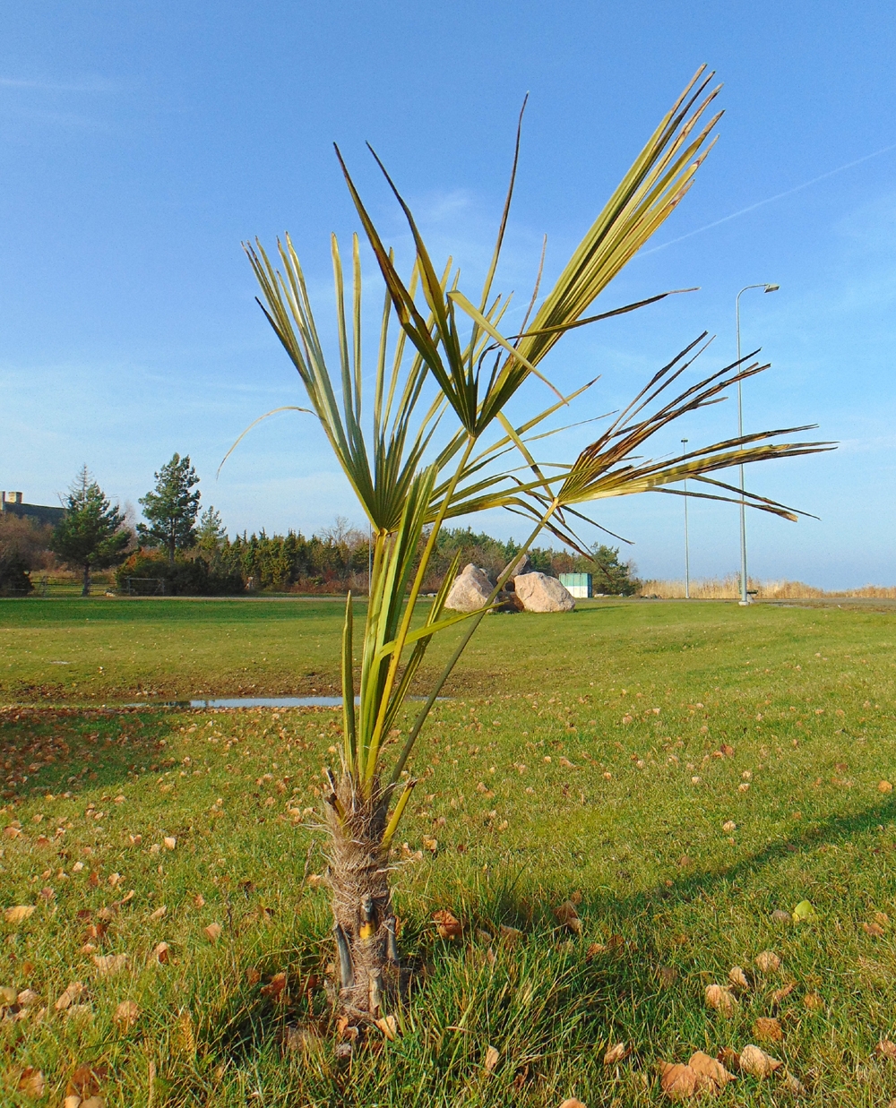 Kui ühel oktoobrihommikul praami oodates ajaviiteks jahisadamasse kõndisin, tekitas seal haljendav palm mus ausalt öeldes väiksemat sorti vapustuse. Oma ootamatuses kui välk selgest taevast. Ja naerma ajas ka. No ütle nüüd keskit naljahammast, siia kainaabruse muruväljale palmi maha istutanud! Jalakõrguse kiulise tüvega, kuni vööni lehtedega karuspalmi. Vist millalgi juba mõne aja eest, sest rohi ta ümber on muust murust pikem.