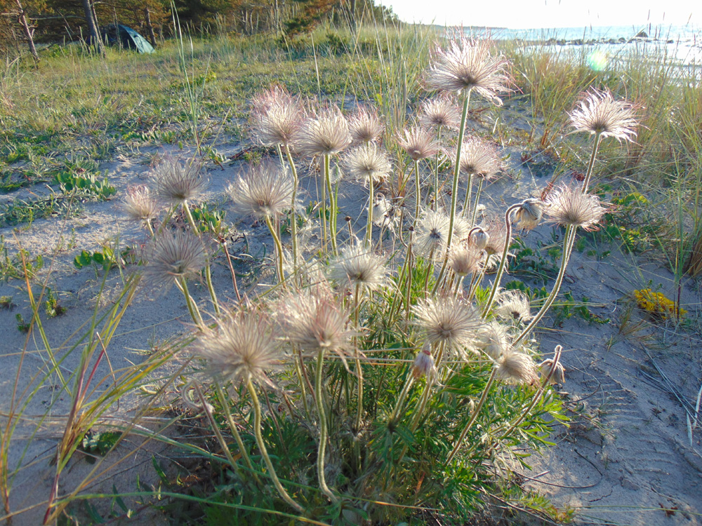—- Edasi Kõpu Hirmuste rannast mingit säärast üllatust ei järgnenud. Lihtsalt uhke liivamaa ja avamere kohtumispaik. Lainevallid mühasid, idas meri üli­intensiivselt sina kumamas, kauguses Tahkuna ots fata­morgaanana õhku tõusmas. Ainult hirmus jahe oli siin, lausa arktilise suve tunne. Eks mere ülessoojenemine suve algul võta ju aega. Kuid merihumurid õitsesid siin liival, rand-seaherne lillaõisi ning kukeharja kollaseid õilmeid kohtasime kah. Vares- ja luidekaer kõhistasid laine­müha sekka ja joonistasid enda ümber liivale poolringe ning aas-karu­kellade uduvilja­kerad värelesid tuules. Päris eriline vaade: säherdused pehmekarvased tegelased sedasi otse luiteliival.